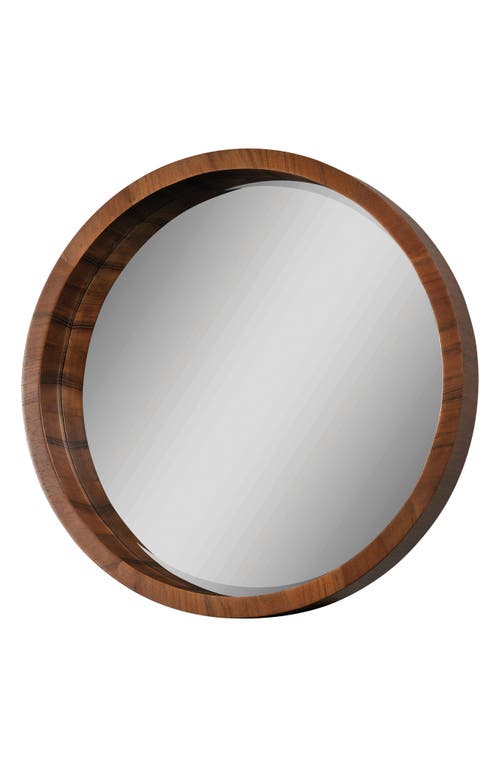 Brybjar Mirror Round Contemporary circular mirror with walnut veneer frame and beveled mirror. Made of Glass - Finish: Walnut veneer - Material: Solid wood - Shape: Round - Size: Medium - Item Depth: 4.5 - Item Height: 33 - Item Width: 33 - Item Weight: 28 - Framed/ Unframed: Framed - Hanging Direction: Horizontally and Vertically - Hanging Hardware Included: Yes - Item Material: Glass - Vendor Color: Brown